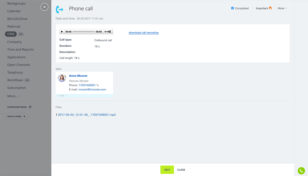 O CRM do Bitrix24 forma uma base de contato onde a interação e o histórico de contatos são gerenciados e armazenados. Todos os novos eventos, como chamadas telefônicas, mensagens, e-mails e reuniões ligadas a um contato ou empresa, são facilmente (ou mesmo automaticamente) registrados e exibidos na gravação apropriada.